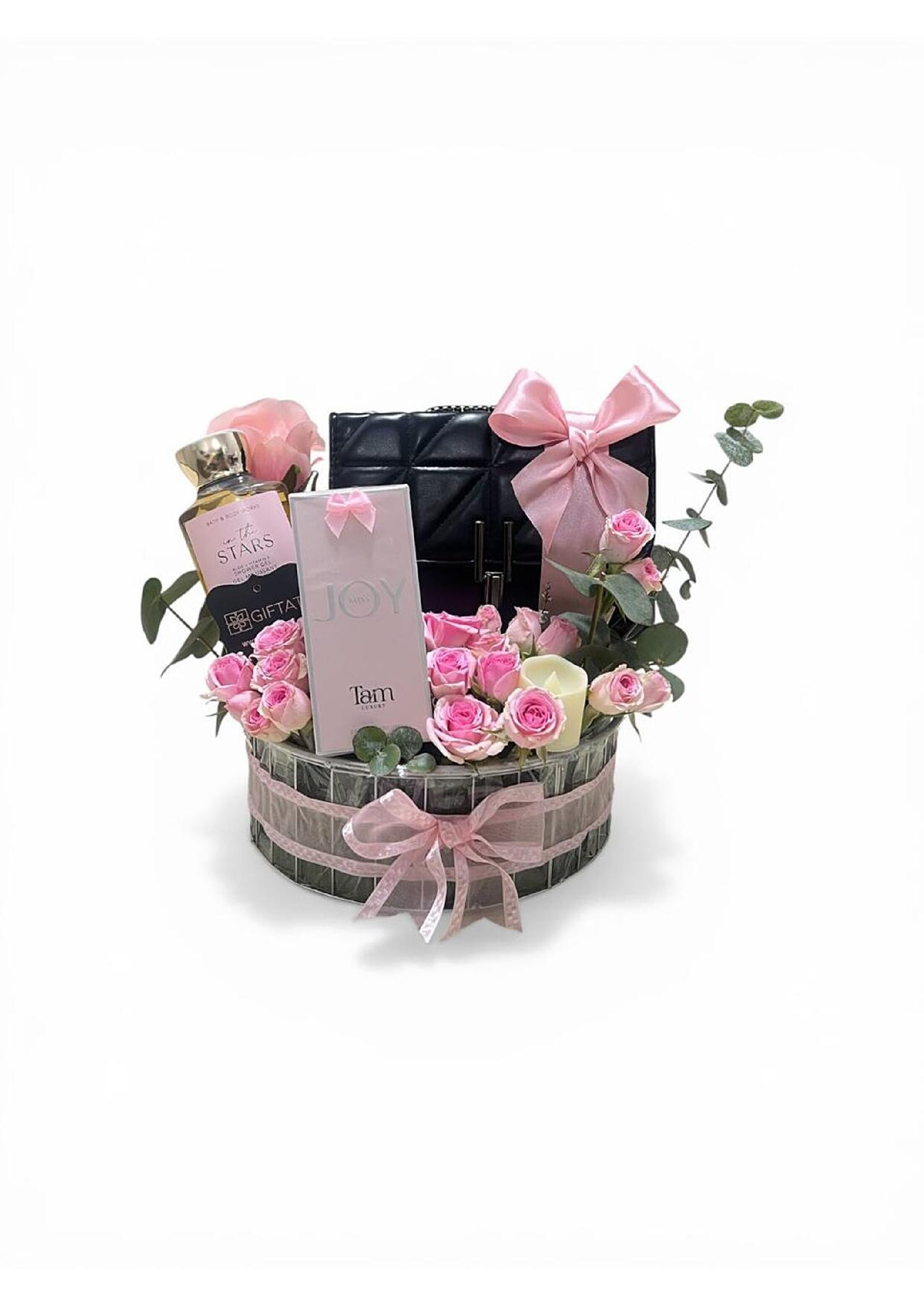 Chocolates with nuts from Bake Al Arab with baby roses , gebso and pink roses